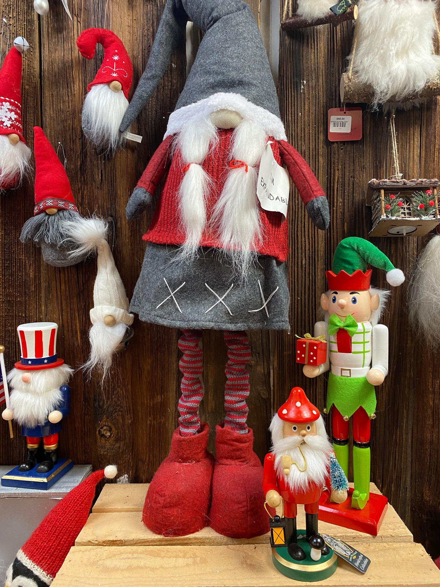 A corner of our shop filled with various Christmas gnome ornaments, nutcrackers, figurines, garlands, and more.