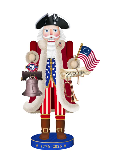 Celebrate 250 years of American history with Kurt Adler's 14" 250th Anniversary of America Nutcracker! This stunning patriotic nutcracker is a tribute to the nation's legacy, featuring bold red, white, and blue colors, a sparkling golden hat, and intricate details like the American flag and a commemorative plaque. Standing 14 inches tall, this collectible piece is meticulously crafted to honor the spirit of freedom and independence. Perfect for decorating your home, office, or mantel, it’s a meaningful addition to any patriotic display or holiday décor.