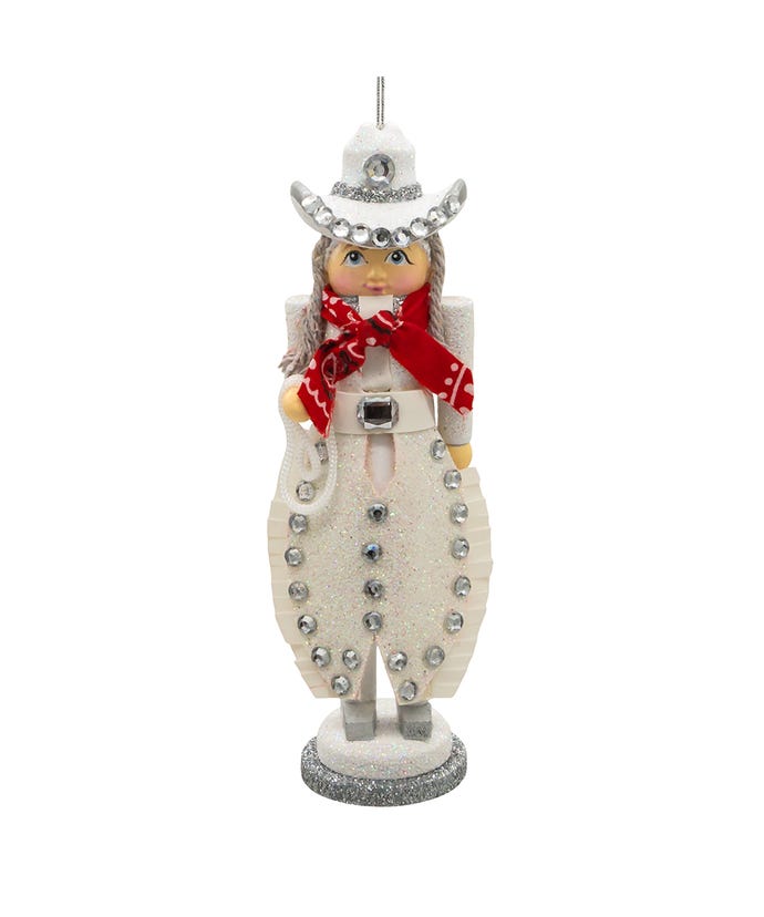 Hollywood Nutcrackers™ is a whimsical collection of nutcrackers created exclusively for Kurt S. Adler, Inc. and features an assortment of designs that put a unique, vibrant, memorable twist on traditional nutcrackers. This 6-inch cowgirl nutcracker ornament features a cowgirl wearing a white glittered outfit with clear rhinestone accents and a matching cowboy hat. She is holding a lasso in one hand and is standing on a matching silver and white glittered base.