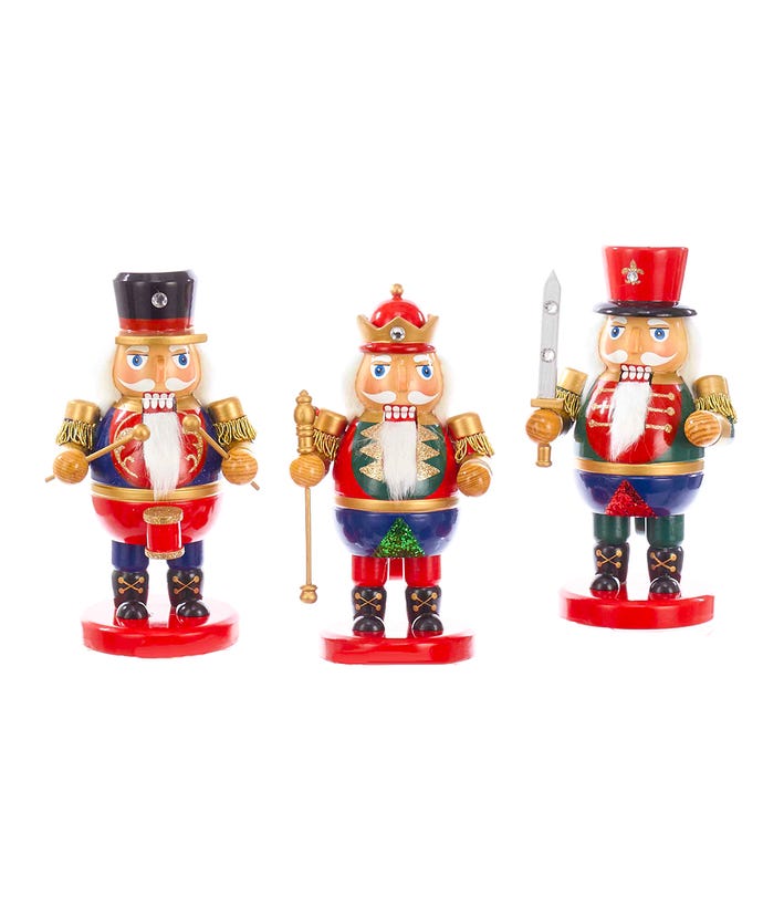 This assortment of wooden chubby soldiers and King nutcrackers is an elegant addition to any holiday or home decor! Each nutcracker is wearing black boots with golden accents.