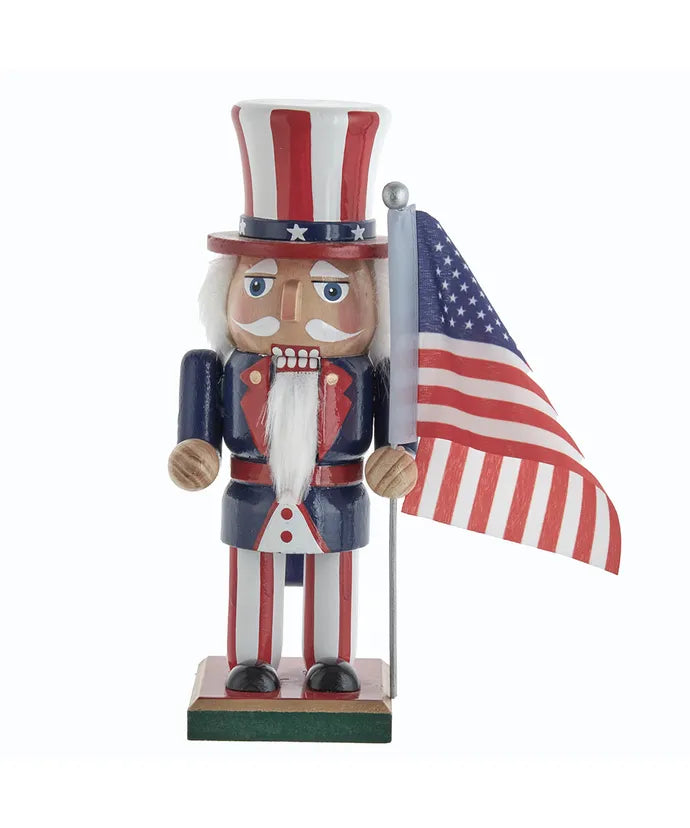 This wooden American nutcracker from Kurt Adler is a fun and festive addition to any holiday décor or nutcracker collection. Its patriotic-inspired design features a red, white and blue color scheme and a matching hat. He is proudly holding an American Flag as he stands on a red and green with gold trim base.