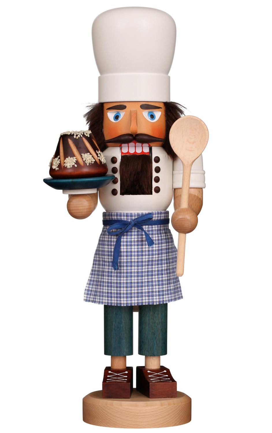 32-563 - Christian Ulbricht Nutcracker - Baker with his blue apron and freshly baked cake - Made in Germany - 16.5"H x 6.5"W x 5.1"D
