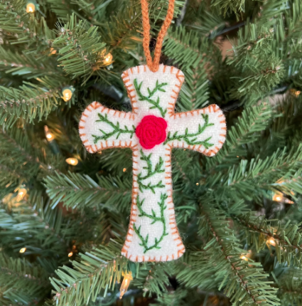 Celebrate the reason for the season with our NEW Embroidered Cross Ornament! This beautiful addition is handmade in Peru, South America using traditional craftsmanship. The plush ivory cross is expertly embroidered with green vines and features a red rose at the center. Looks beautiful on a Christmas tree!