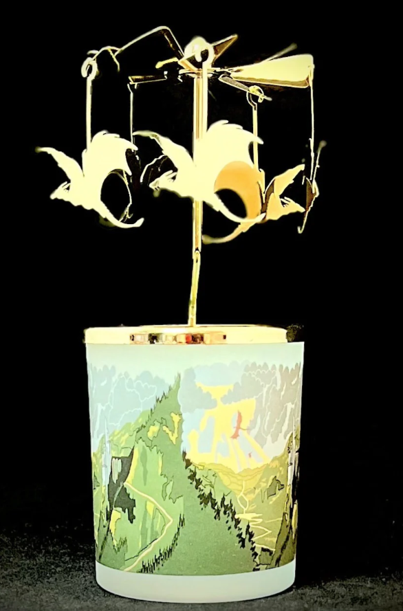 Compatible with tea light candles, although package does not come with one. Includes 1 frosted votive base, 1 support bar/spindle, 1 rotary blade, and 5 ornaments with hooks.