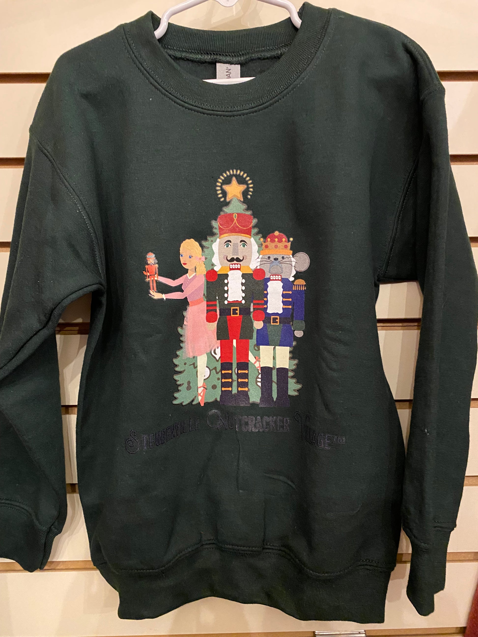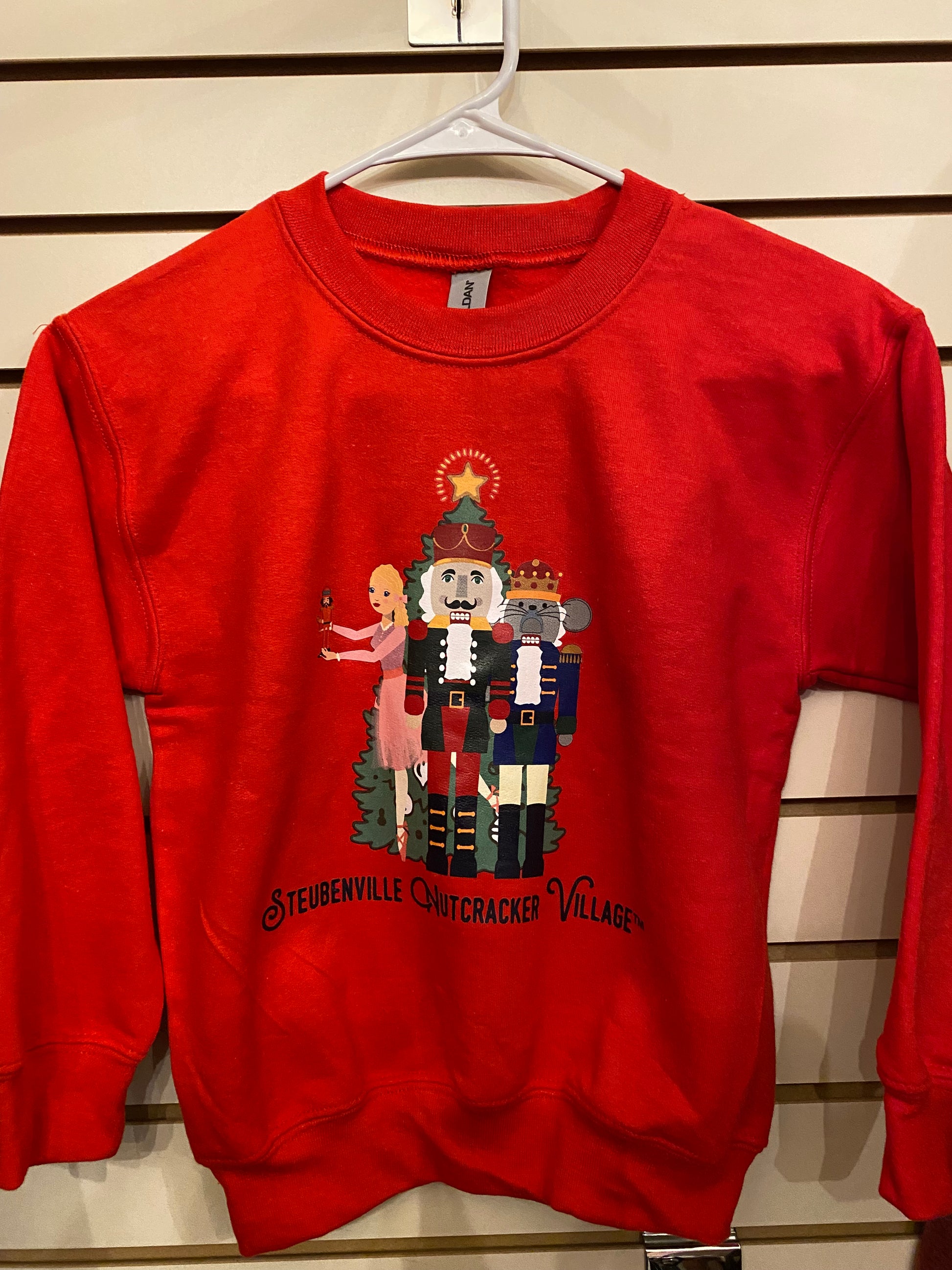 Steubenville Nutcracker Village crewneck sweatshirts for children. Available in bright red or green. 50% cotton, 50% polyester.
