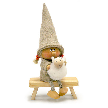 Nordic Dreams linen dwarf in beige linen girl holding lamb.
