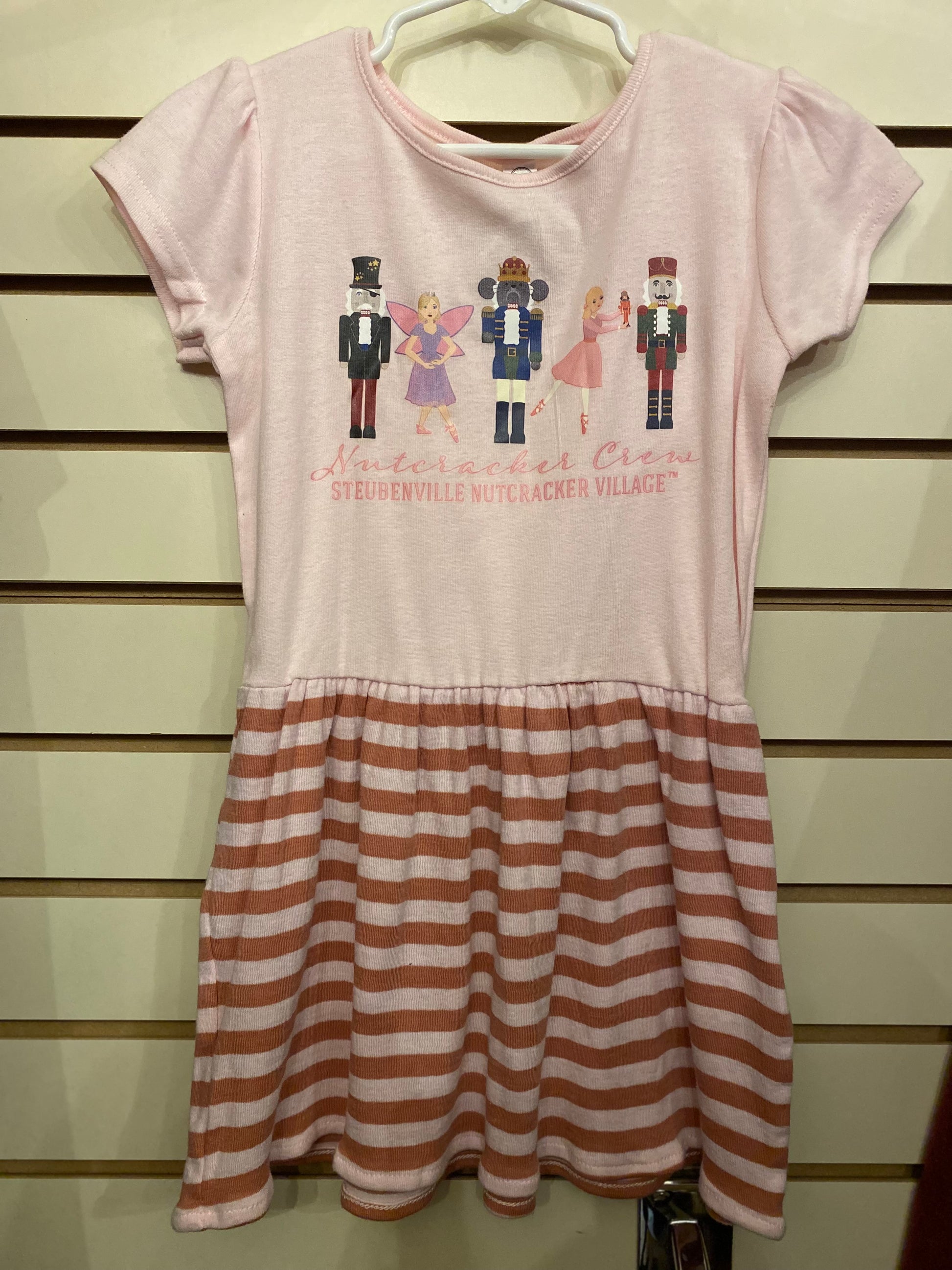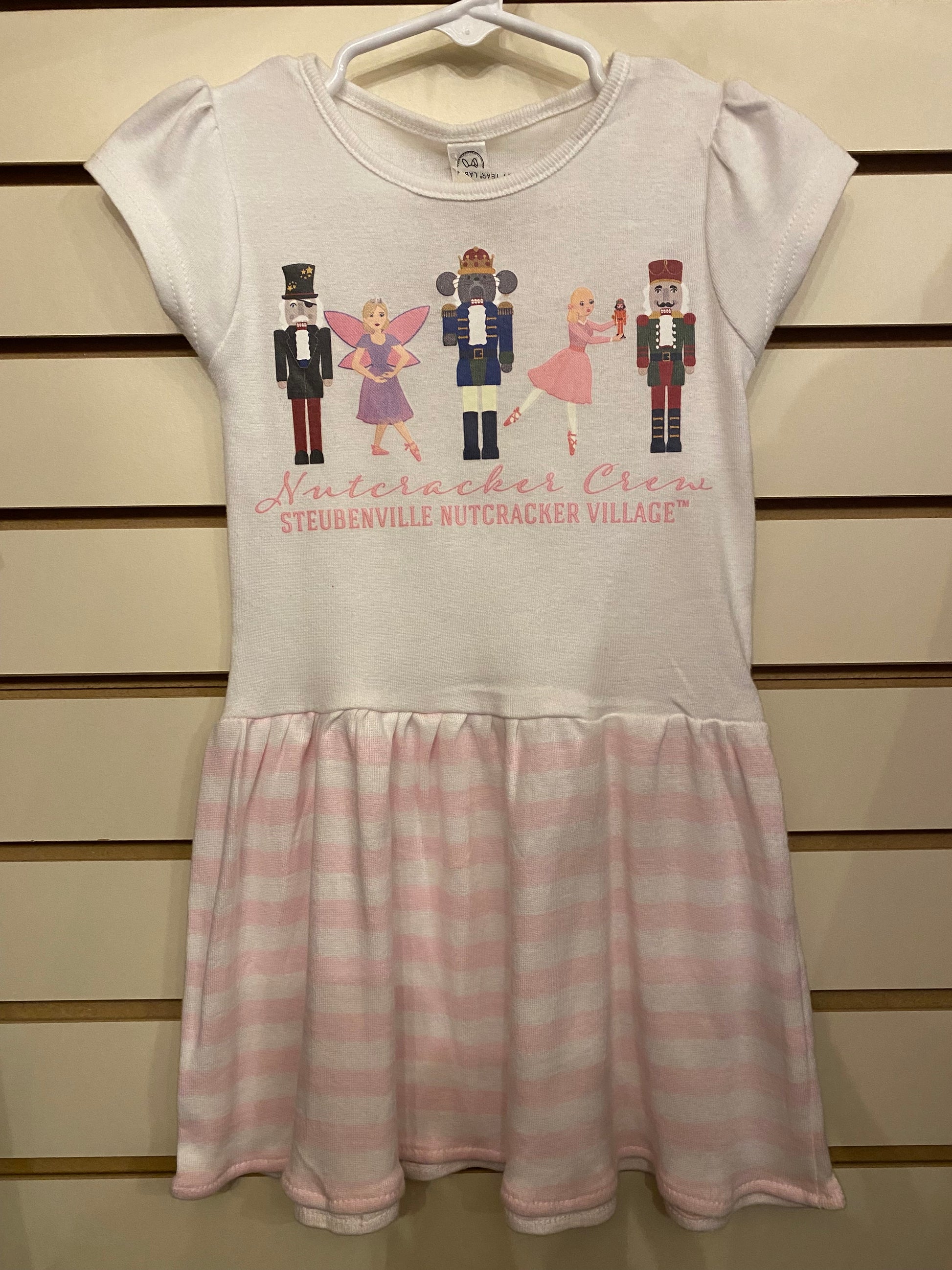 Nutcracker Crew Toddler Dress. Available in two styles: white top with a light pink stripe skirt, or light pink top with dark pink stripe skirt.