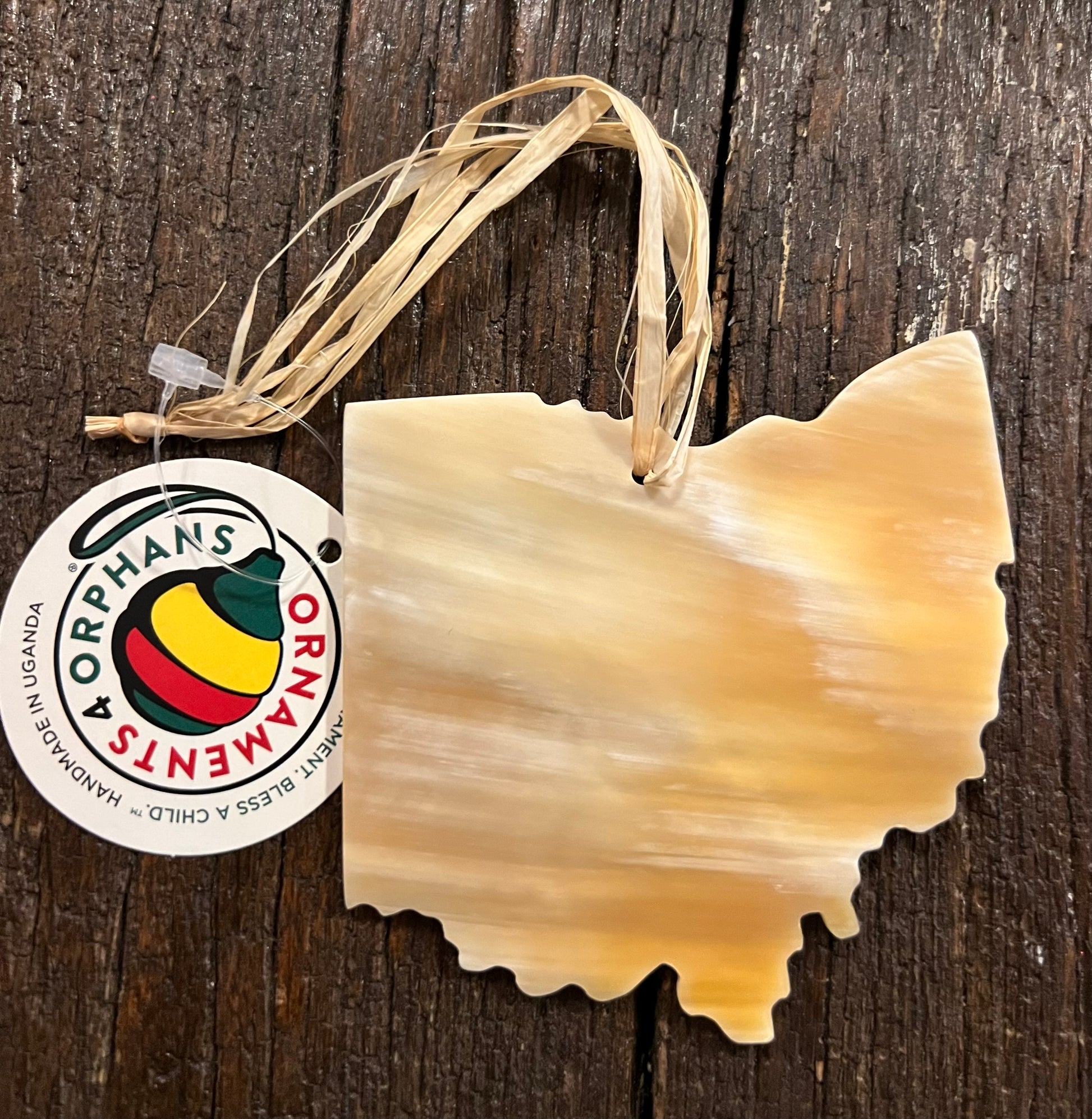 Our Ohio Cow Horn Christmas Ornament is a celebration of this wonderful state. Artisans in Uganda, East Africa repurpose discarded Watusi cattle horns to create this elegant piece. Each horn is naturally unique in grain and shading. Expect minor variations in color. This ornament will stand out beautifully on your evergreen Christmas tree!