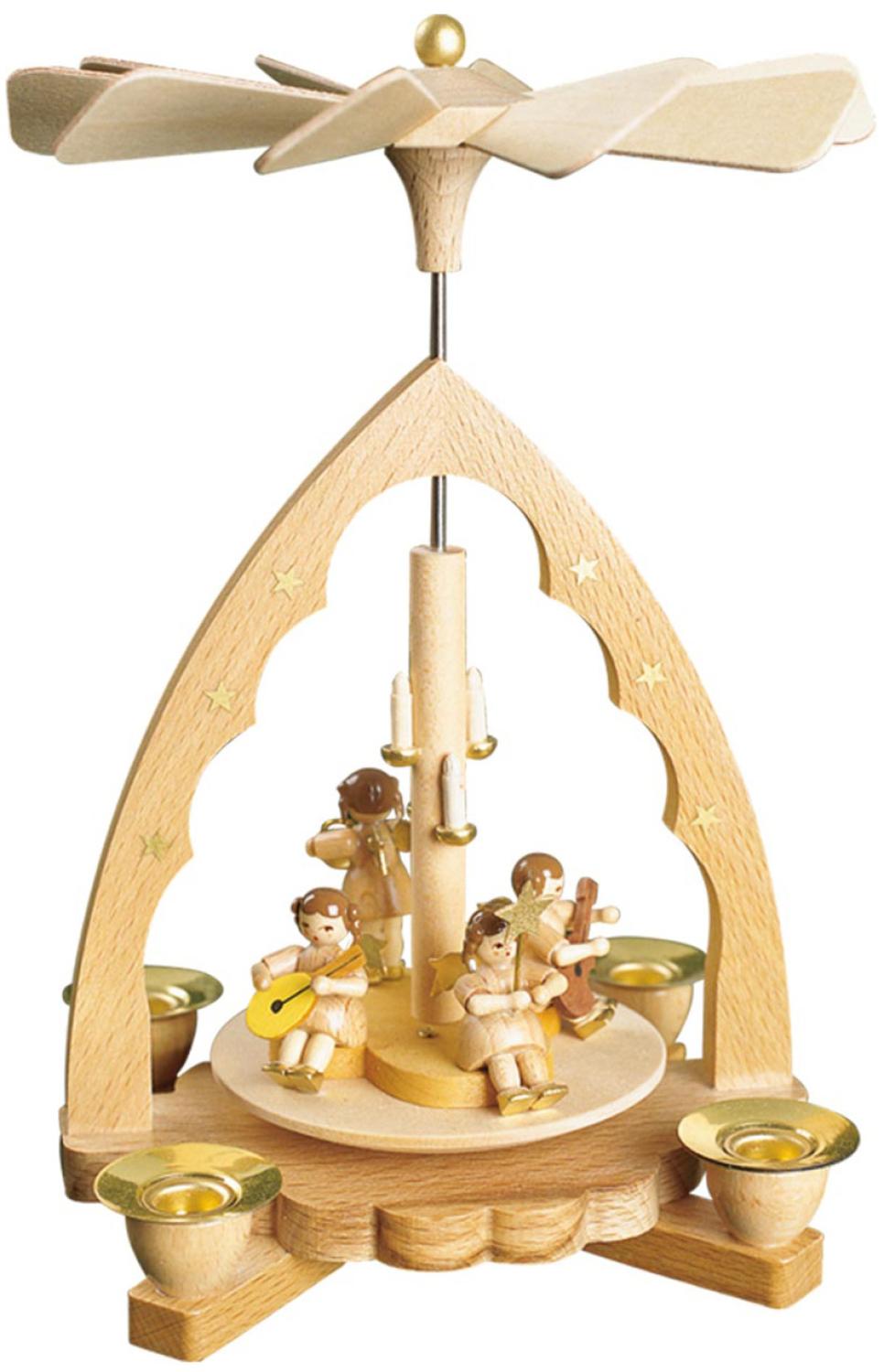 Richard Glaesser pyramid - natural wood color arch design with musician angels - made in Germany - uses #29320 white or #29319 red candles. Heat rising from candles turns paddles and base. Traditional table decoration. - 8"H x 5.25"W x 5.25"D