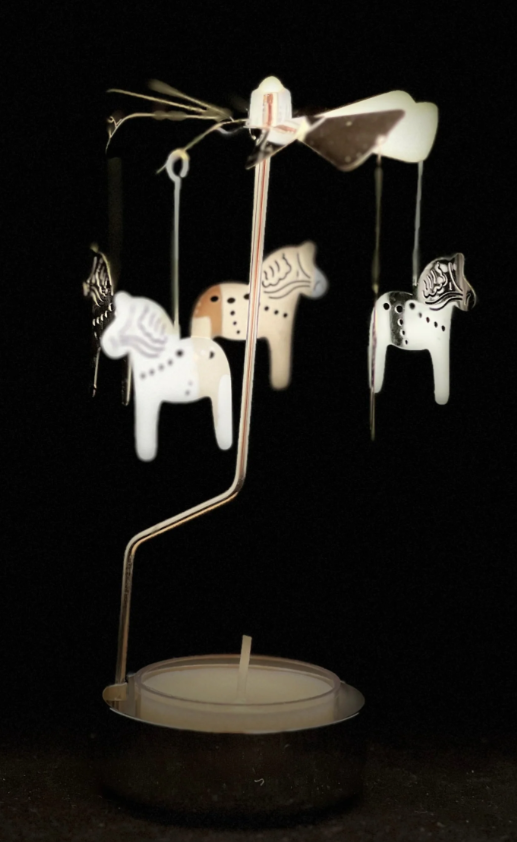Swedish horse/Dala horse rotary candleholder with base, stand, rotary blade, and five ornaments with hooks. Compatible with regular tea lights. Silver color.
