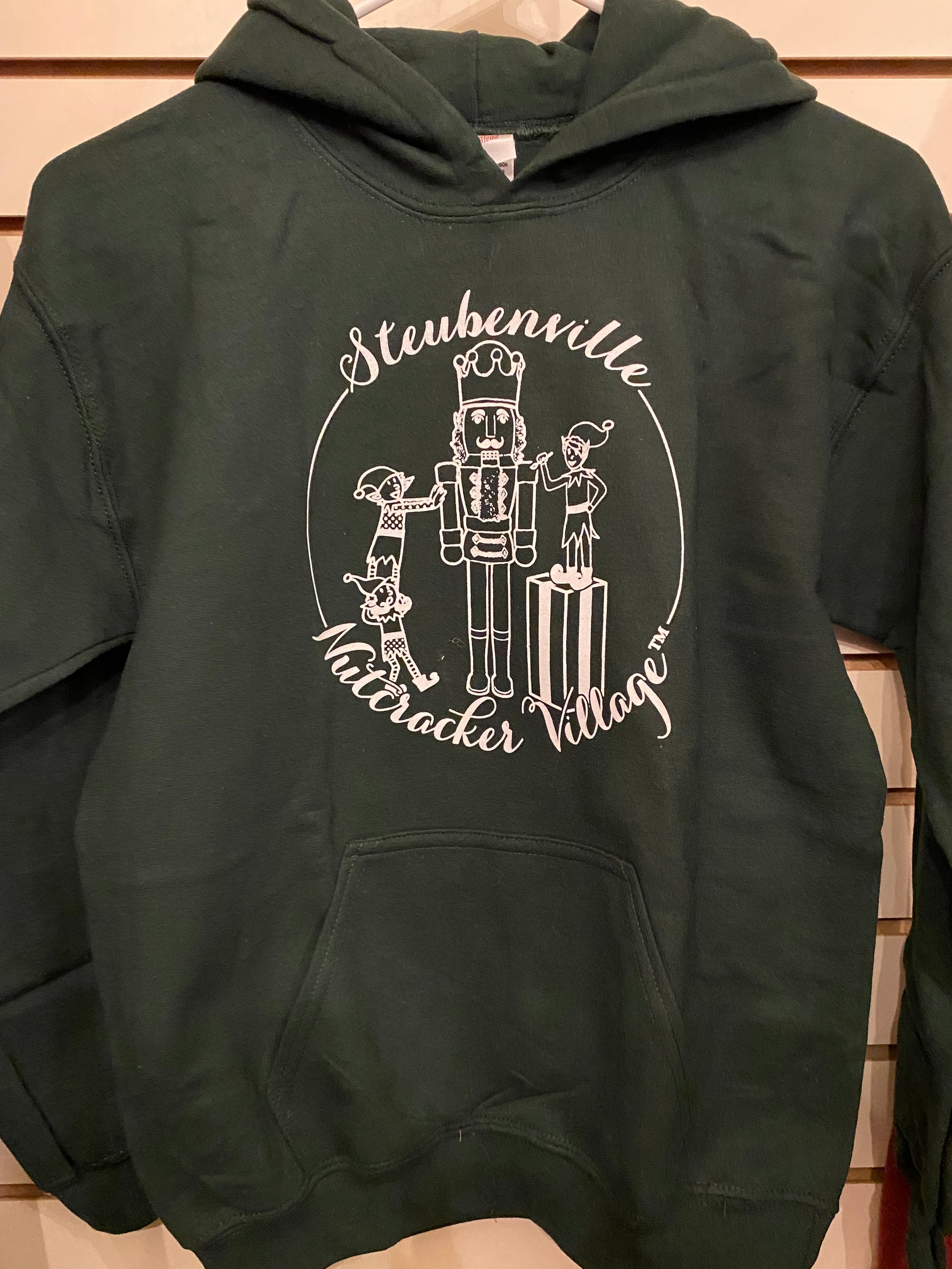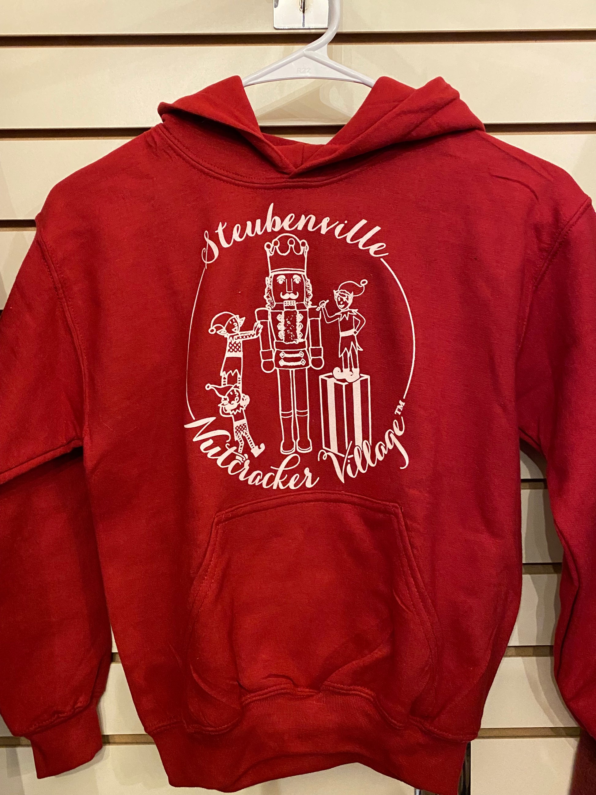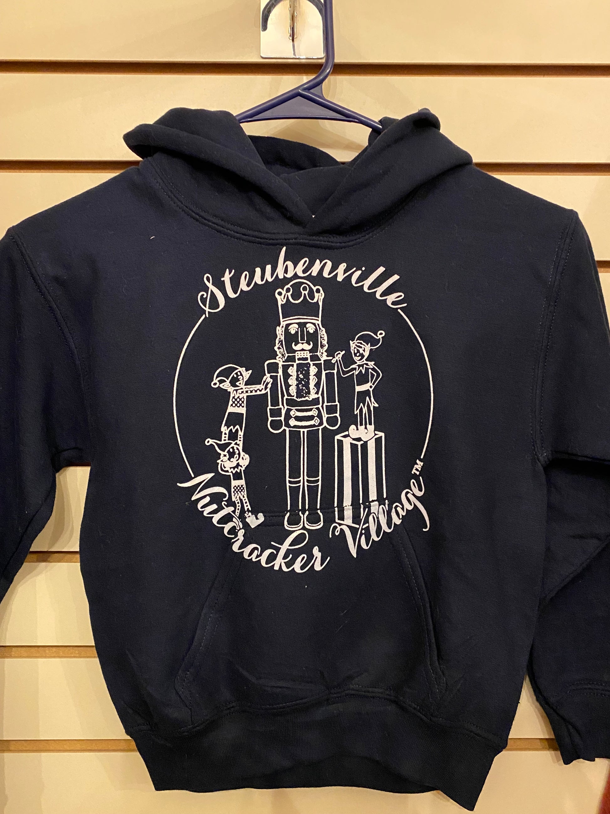 Steubenville Nutcracker Village Kids Hoodie. Available in navy, red, and dark green.