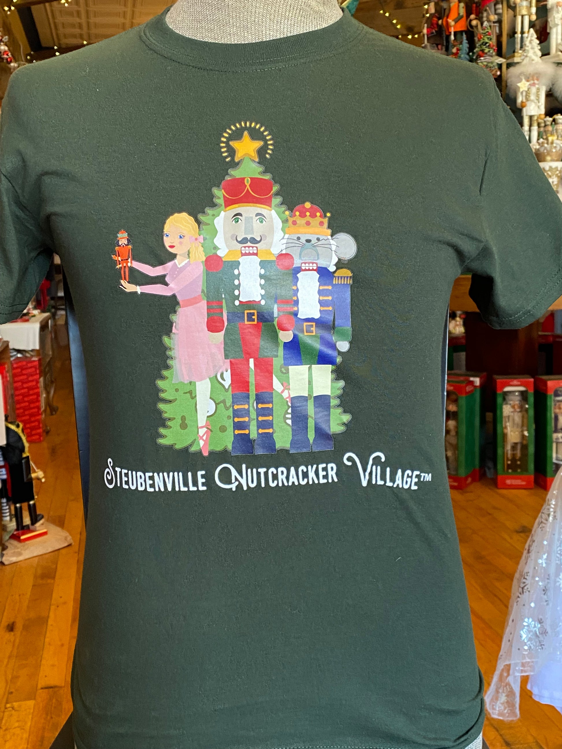 Green and blue "Steubenville Nutcracker Village" T-shirts.
