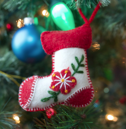 A simple and timeless design, our Embroidered Wool Stocking Ornament is handmade by artisans in Peru, South America using traditional craftsmanship. Each white stocking is handstitched and embellished with iconic Christmas colors. Celebrate the old-fashioned way with this classic style.