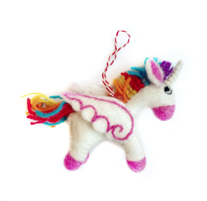 Make this Christmas magical with every princess' favorite mythical creature! Our Felt Wool Unicorn Christmas Ornament is handmade by artisans in Nepal, Asia using colorful sheep wool. Its white wings are edged with pink and and its rainbow mane is vibrant and fun! Popular for their charming and durable designs, felt ornaments are make excellent stocking stuffers and holiday gifts. Shop our full collection of felt ornaments HERE.